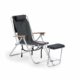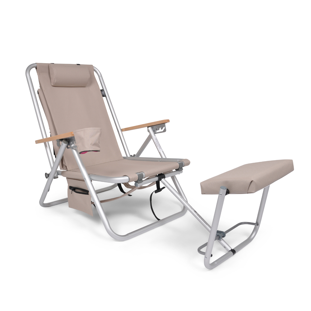 En friluftsstol med trähandtag, ställbar rygg, ryggsäck och fotpall. Denna modell har även kylbag och mobilficka.